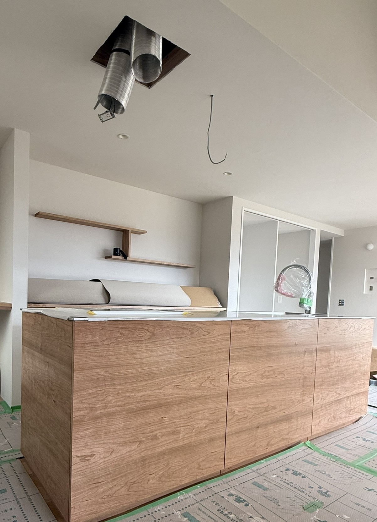 今回制作したのは、ヌック建築工房さんの住宅に収める アイランドキッチン と、背面の引出収納です。